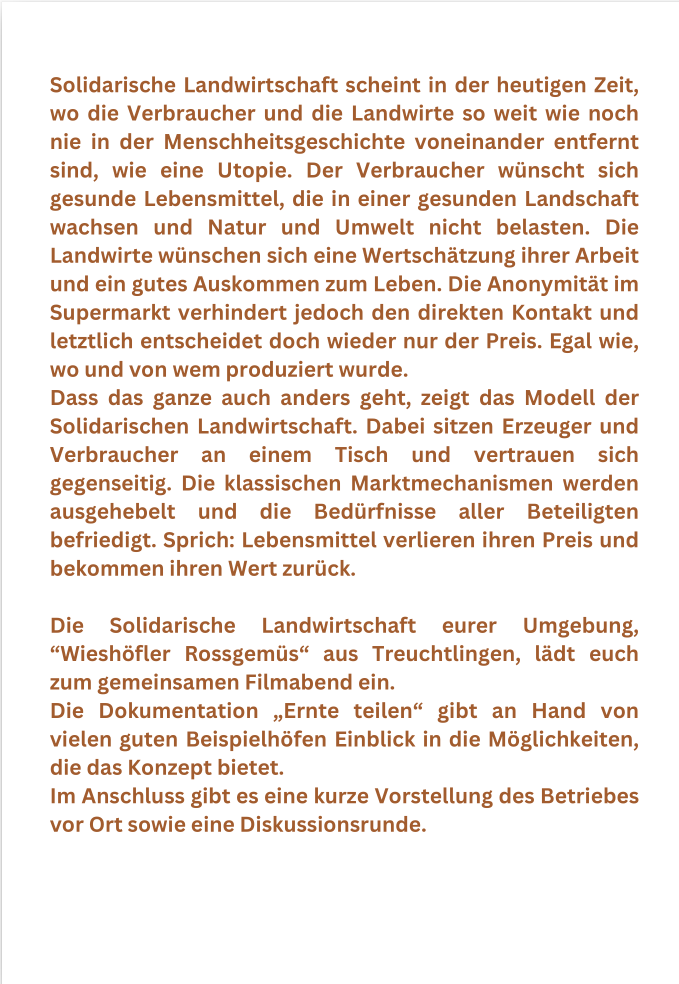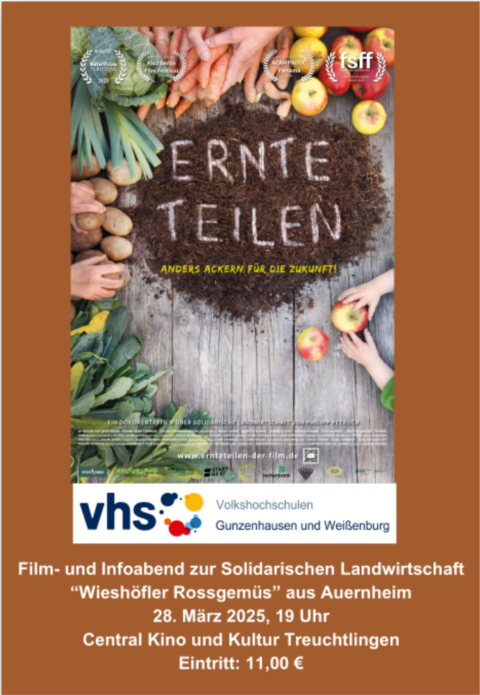Infoabend und Film zur SoLaWi 28. Mrz 2025 Datum/Zeit 28.03.2519:00 - 21:30 Kategorien Keine Kategorien Die Veranstaltung findet am 28.03.25 um 19 Uhr im Kino Central in Treuchtlingen statt!